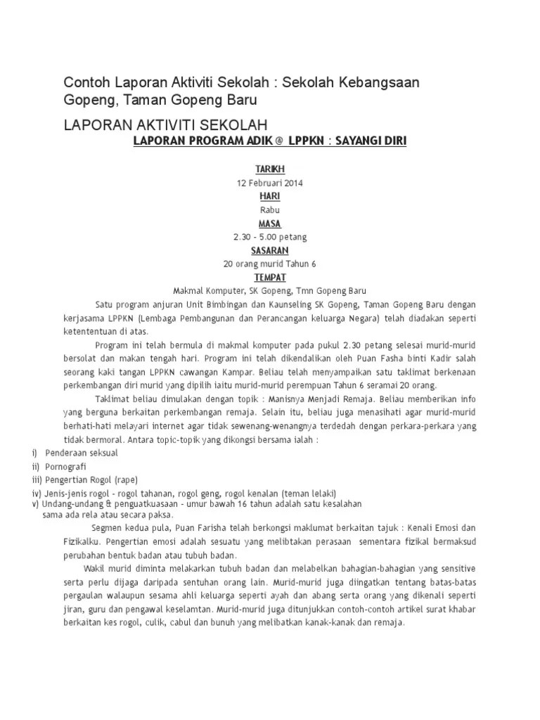 Memupuk semangat kerjasama dalam aktiviti kumpulan 6. Memberi peluang kepada warga sekolah terutama para pelajar mengaplikasikan ilmu pengetahuan dan kemahiran yang dipelajari dalam aktiviti koakademik, . Laporan ringkas aktiviti sekolahfull description. Contoh format penulisan laporan · 2. Sekolah kebangsaan abc 00000 ipoh, perak laporan aktiviti / program kurikulum / hem / kokurikulum1.